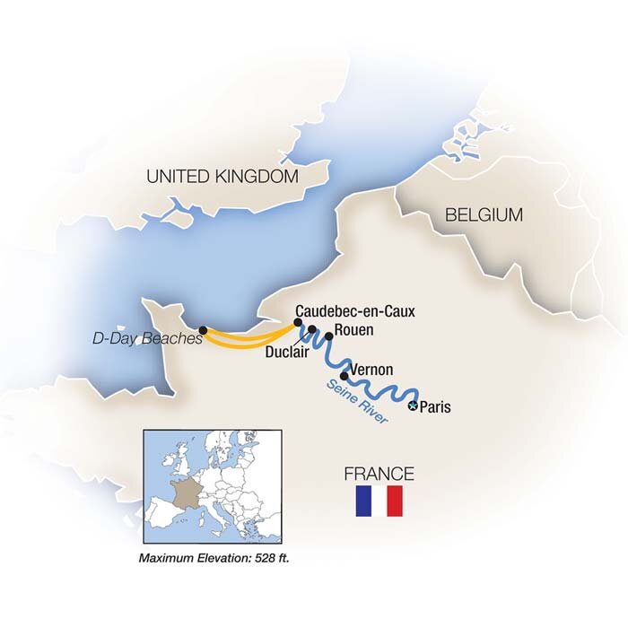 This morning, arrive in Caudebec-en-Caux for a poignant visit to the beaches of Normandy. Led by a local expert, delve into the events, heroism, and sacrifices of June 6, 1944, and the Allied liberation of Western Europe. Visit Pointe du Hoc, where 225 U.S. Army Rangers scaled 100-foot cliffs to disable German weapons threatening Omaha and Utah Beaches. Walk Omaha Beach, one of the five D-Day landing sites, where history comes alive on the sand beneath your feet. Pause for lunch at nearby 18th-century Château La Chenevière, a graceful English-style country manor with French flair, before reflecting at the Normandy American Cemetery – the final resting place of more than 9,300 American troops.