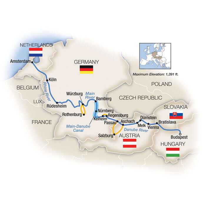 Today, your riverboat negotiates the Main-Danube Canal, which ultimately links the North Sea with the Black Sea; learn about the canal's history from a local expert during your transit. The idea goes back as far as Charlemagne, but wasn't realized until the canal's completion in the 1990s; pass through 16 locks as the waterway traverses the mountains.