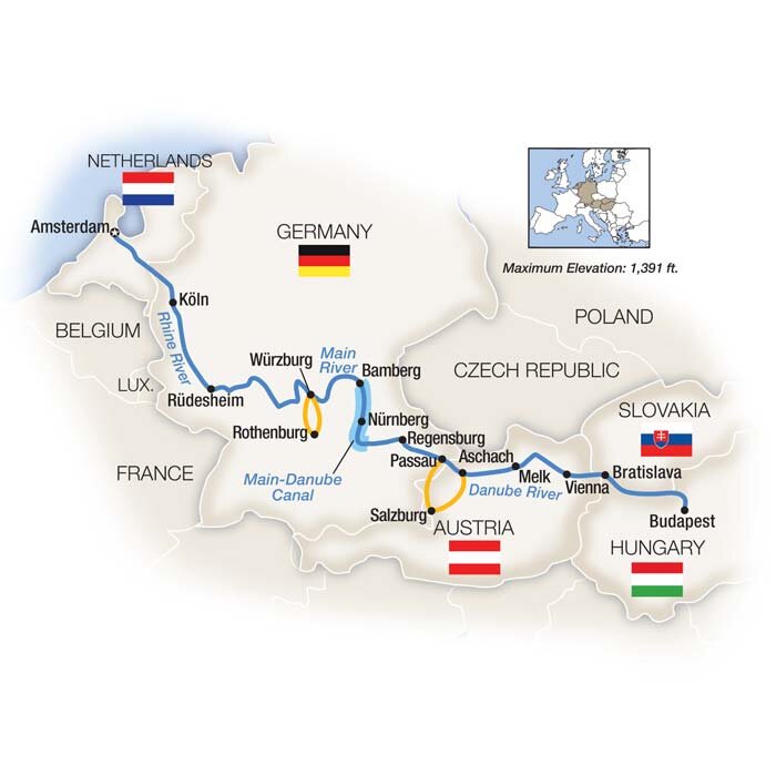 Tour begins: 5:00 PM, Amsterdam. A transfer is included from Amsterdam's Schiphol Airport or Central Station directly to your riverboat. Enjoy a welcome briefing and a leisurely dinner as you settle into your floating hotel for a memorable two-week-cruise on the Main, Rhine and Danube Rivers. Stay 14 Nights: Tauck River Ship (D)