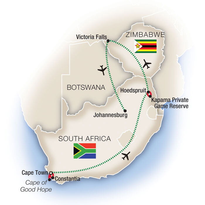 After a leisurely breakfast, bid farewell to Kapama and catch a flight to Victoria Falls, Zimbabwe.