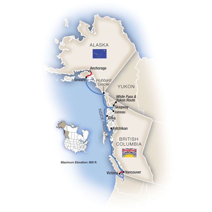 Spend a full day at sea aboard ship, cruising the Inside Passage and coastal landscapes of British Columbia en route to Vancouver. This famed waterway is a labyrinth of forested islands, secluded fjords, and misty mountain peaks, offering breathtaking views at every turn.