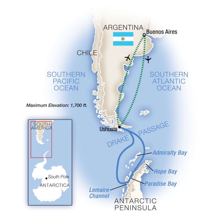 Your Antarctica cruise ends when you disembark ship today in Ushuaia for your flight back to Buenos Aires. A transfer to Buenos Aires' (Ezeiza) Ministro Pistarini International Airport is included. Tour ends: 6:00 PM, Buenos Aires' (Ezeiza) Ministro Pistarini International Airport. You should allow three hours for flight check-in. (B)