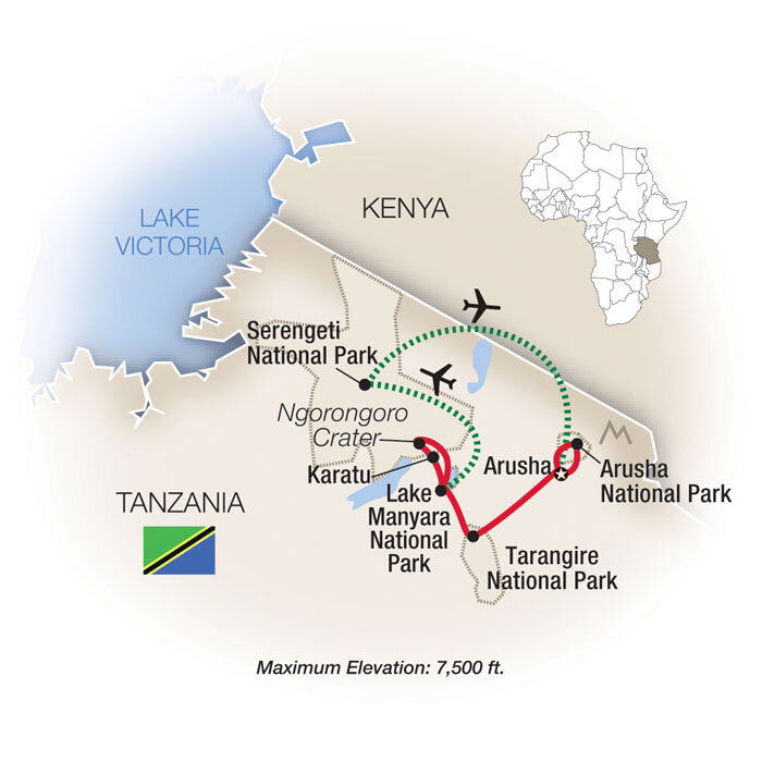 One of the best places on this Africa tour to spot the Big Five – elephants, leopards, lions, buffalo and the rare black rhinoceros – ancient Ngorongoro Crater, often called Africa's "Garden of Eden," is home to almost every species in Africa... except the giraffe, which can't negotiate the steep incline down into the caldera. Game drives and a unique picnic lunch on the crater floor offer ample opportunities to spot lions, cheetahs, hippos and lots of birds. Then it's back to your lodge in Karatu for the evening. (B/L/D)