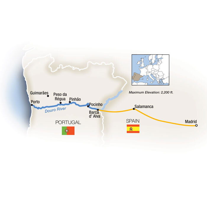 Then head to the riverside village of Barca d'Alva – a quiet town on the Portuguese border surrounded by placid, reflecting waters, close to the unspoiled wilderness of Arribes del Douro Natural Park – where your riverboat awaits; the hills are rich with olive groves, vineyards, and almond orchards that bloom with white flowers in spring. Embark, settle in, and join us tonight for a welcome reception and dinner. Stay Seven Nights: Tauck River Ship (B/D)