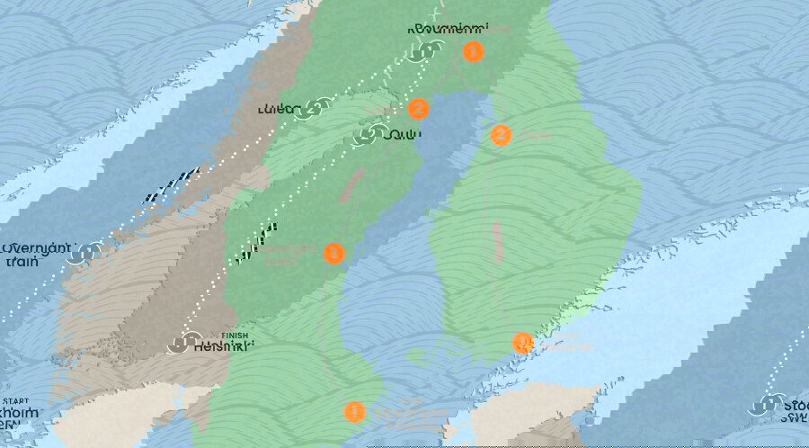 After another included brekkie, we'll wave goodbye to Oulu and board the train for Helsinki – Finland''s quirky capital city. This is your chance to catch up with the rents and swap tales with your trip mates. When we arrive this afternoon, we'll get our bearings on a city walking tour. Tick off the A-list sights with your Trip Leader, including the historic Senate Square, the eye-popping Uspenski Cathedral and the space-age Oodi Library.