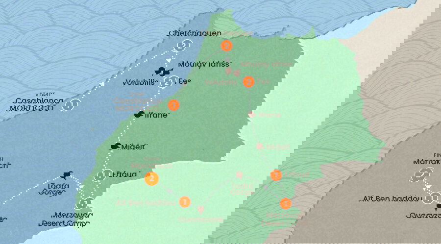 Swap glittering blue coasts for bluer-than-blue cities – we're rolling onto Chefchaouen. Nestled between the looming peaks of the Rif Mountains, this enchanting city is totally out of this world. Brilliant blue buildings. A maze of narrow alleyways. And authentic local vibes. We'll get our bearings on a stroll with our Trip Leader, then choose to tuck into dinner at a local restaurant with the gang or head off and do your own spontaneous this-is-what-I-came-for thing. It's 100% up to you. Stay: Puerta Azul or similar (B)