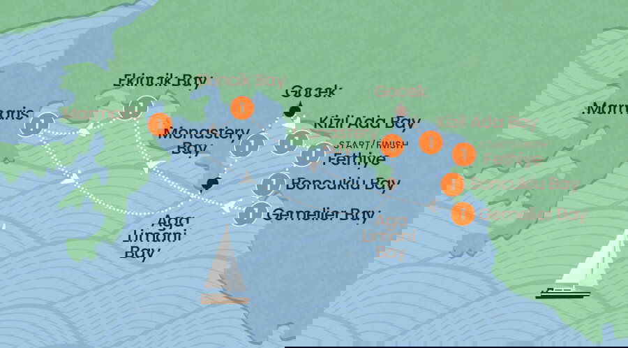 Next stop: the beautiful Gocek Bays. This cluster of stunning coves is sure to impress. We'll zigzag between Sarsala Bay, Boynuzbükü, Bedri Rahmi Bay and Gocek town, before anchoring in Kizil Ada Bay for the night. After another delicious chef-prepared dinner, gather the crew and break out the playing cards—Go Fish, anyone? Stay: Motorised sailboat (B/L/D)