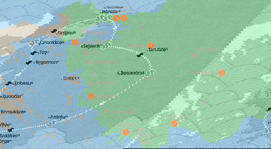 Today, we'll make our way back to Istanbul. But first: Gallipoli – the historic peninsula with views stretching out over idyllic sandy beaches. We'll pay our respects at the Australian War Memorial at Lone Pine and the New Zealand Memorial at Chunuk Bair. Then it's onto ANZAC Cove and the Turkish Memorial for a chance to stop and reflect on a piece of the past that changed the histories of Australia, New Zealand and Turkey forever.