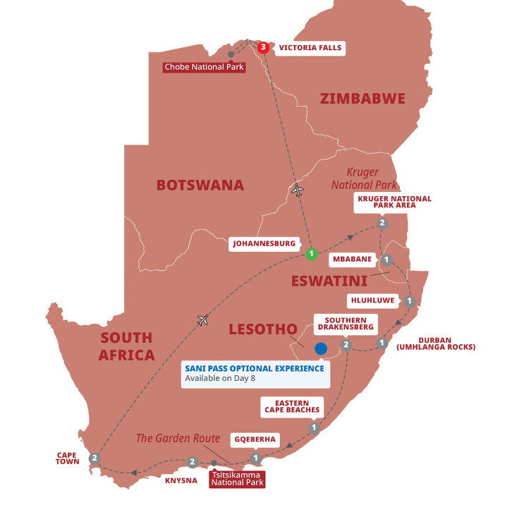 Enjoy the freedom to explore this UNESCO World Heritage Site your way. You might choose to join an Optional Experience and head off-road on a 4x4 Sani Pass adventure, climbing to 2,874 m (9,429 ft) and crossing into Lesotho. Stop to take in the incredible mountain views from Africa's highest pub, before enjoying lunch at another local spot en route. Prefer to keep things low-key? Stay grounded and soak up the Drakensberg's dramatic beauty at your own pace. (B/D)