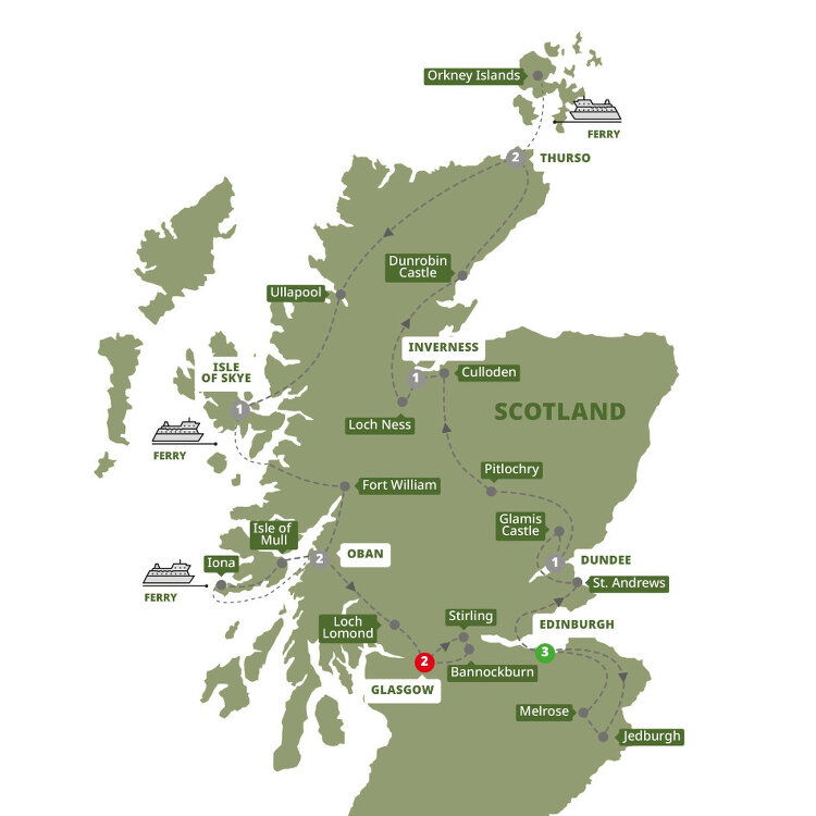 After stopping at John o' Groats, board a ferry to South Ronaldsay in the Orkney Islands. Visit the ornate Italian Chapel, built by Italian prisoners of war. See the prehistoric free-standing stones of the Ring of Brodgar before visiting Skara Brae and delving into the stories of the Neolithic village. Stop at beautiful Kirkwall Cathedral for a photo opportunity before returning to your hotel for dinner. (B/D)