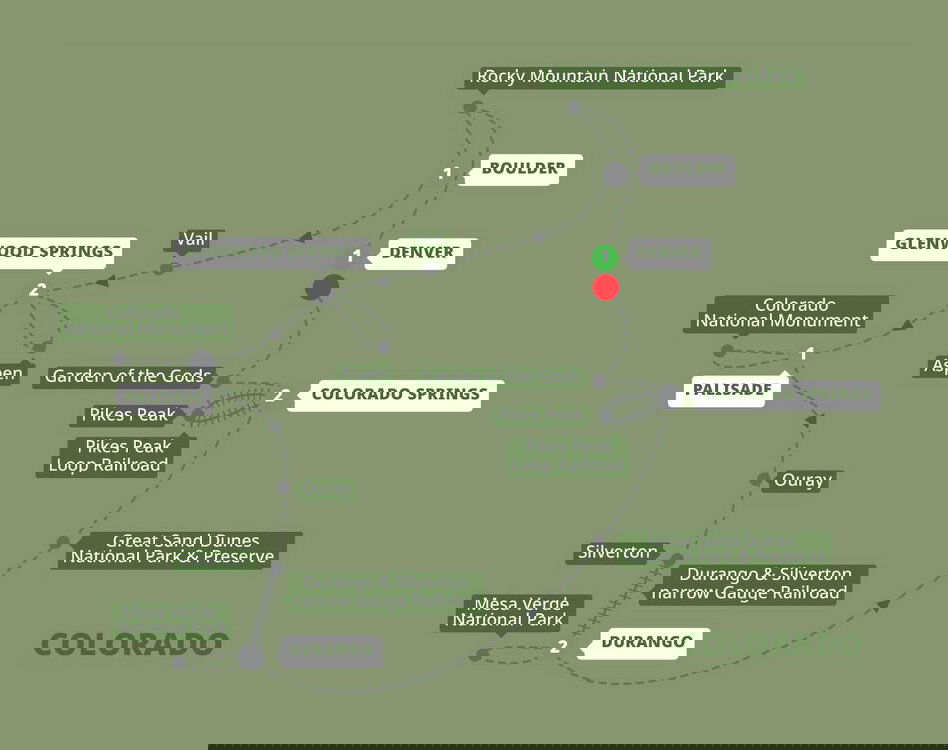 In the afternoon, enjoy the magical town of Manitou Springs before boarding the historic Pikes Peak Cog Railway, the world's highest cog railroad, for an unforgettable trip to the 4,302 meters summit of Pikes Peak. Ride past cascading streams and forests of aspen and pine, enjoy the striking panoramas and learn of Pikes Peak connection with the patriotic song "America the Beautiful.'' Your trip through the Colorado Rockies comes to an end with a local Farewell Dinner where you'll have the chance to raise a glass and celebrate the adventures we've had in Colorado. (B/D)