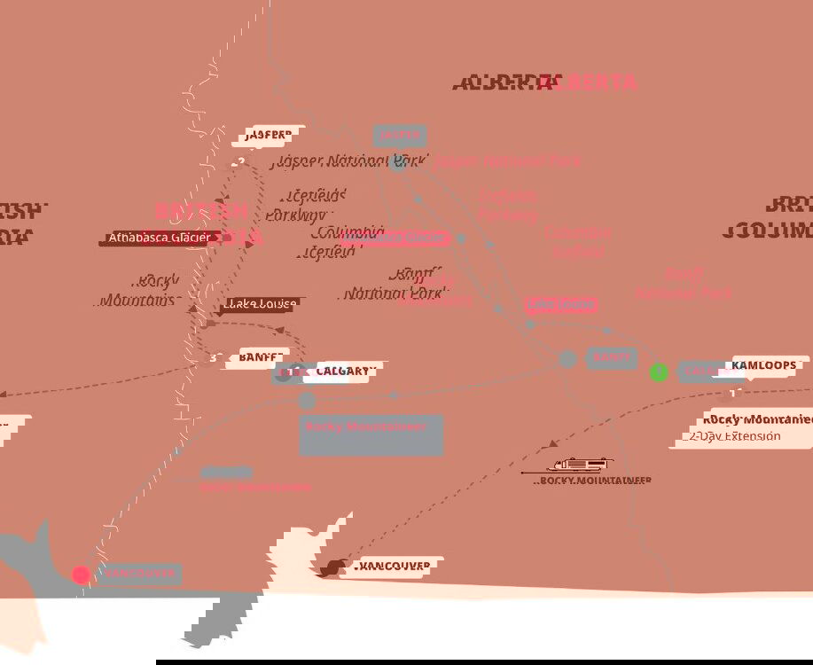 A sensational two-day journey aboard the Rocky Mountaineer with a night in Kamloops. (B/L) Stay: Assigned by Rocky Mountaineer