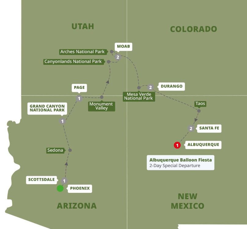 You're in for a wonderful time at Albuquerque's Balloon Fiesta. It is one of the largest and most renowned hot air balloon festivals in the world featuring mass ascensions, special shape balloons, balloon competitions and entertainment. You'll have access to the Chaser's Club, a private outdoor patio to witness the spectacular display of colour and creativity in the sky. (B/D) Stay: Sheraton Albuquerque Uptown
