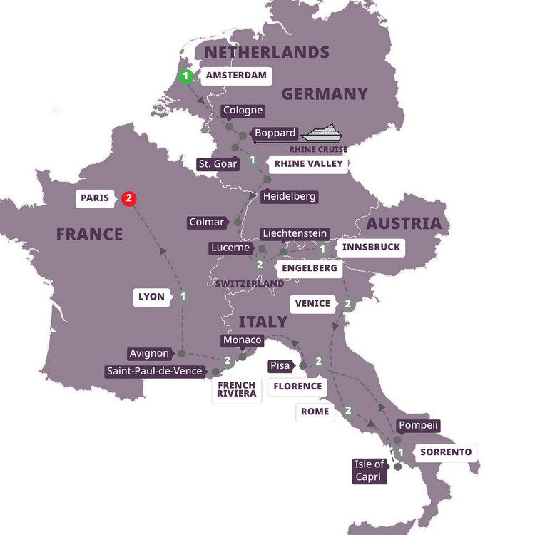 All the highlights of Europe lie ahead on this epic journey from the Netherlands to Austria, Italy to France. Spend the day exploring Amsterdam on foot, by bike or tram.