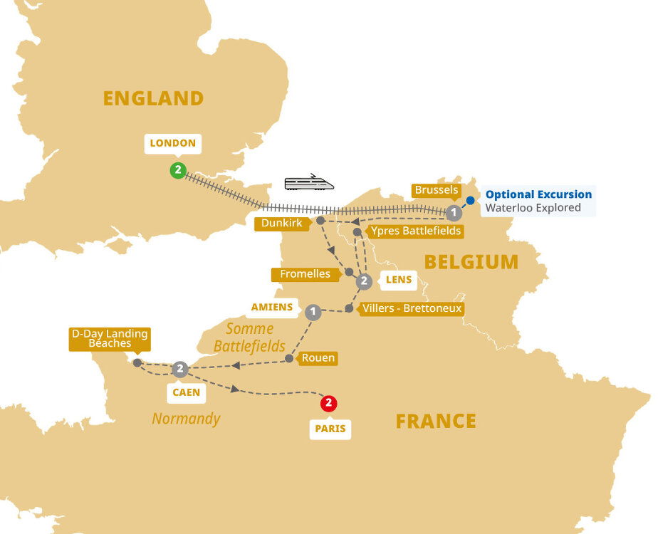 Some of the biggest battles of World War I are explored at Ypres Salient in Belgium, where we will see such sites as Tyne Cot, Langemark and Vancouver Corner. Stop in Zonnebeke for an included visit to the Memorial Museum Passchendaele 1917, where you can see a replica trench. See Essex Farm Cemetery where over 1,200 brave servicemen are buried and where Lt. Col. John McCrae wrote his immortal poem, ‘In Flanders Fields'.