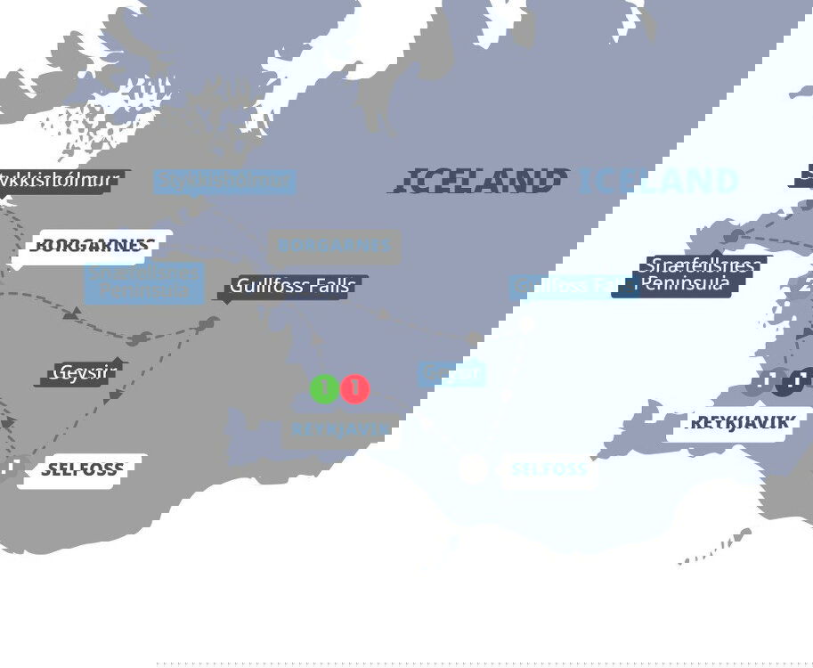 Return to Borgarnes for a relaxed evening at leisure. Perhaps take a stroll along the town's peaceful waterfront promenade, visit the Settlement Centre to uncover Viking history or simply unwind with a hot drink while soaking up views of the fjord. (B)