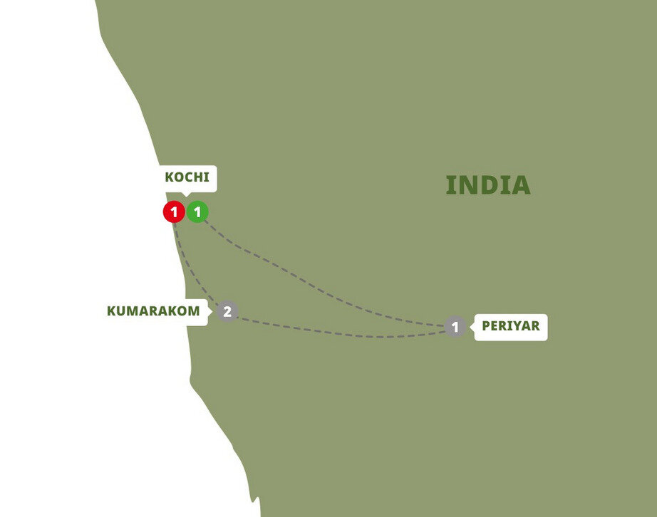 Today you travel into Kerala's lush landscapes to Periyar, named after the state's longest river which winds through the Periyar Wildlife Sanctuary and National Park. On arrival, you may choose to join an Optional Experience boat ride on Periyar Lake, watching for elephants and sambar deer along the shore and looking out for birdlife and smooth-coated otters in the shallows.
