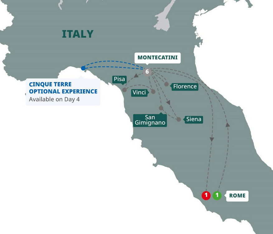 Relax in the spa atmosphere of Montecatini on your day at leisure or join an optional experience to Cinque Terre, whose quaint pastel-hued villages cling to the rugged Ligurian cliffs. (B)
