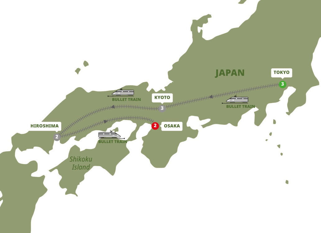 This morning, board a high-speed bullet train to Hiroshima, a lively city that celebrates peace in the shadow of the previous century's devastation. Your first stop is to a local restaurant where you'll enjoy an Okonomiyaki lunch.