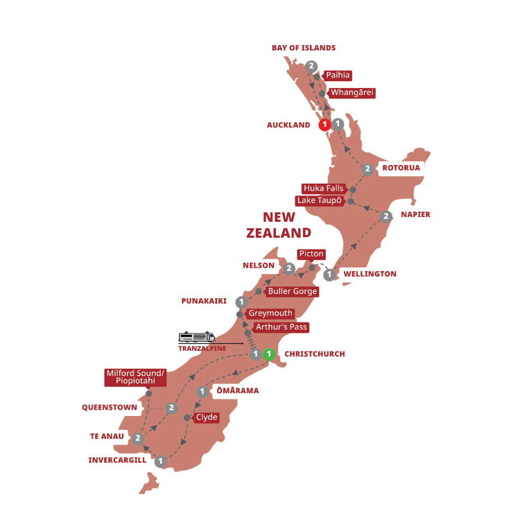 All aboard the TranzAlpine train for one of New Zealand's greatest rail journeys. Travel towards Arthur's Pass, through tunnels and over soaring viaducts as snow-capped peaks, icy rivers, beech forests and deep gorges roll past your window. Stop in Greymouth, known for its mining history, before continuing to Punakaiki to see the famous Pancake Rocks and blowholes.