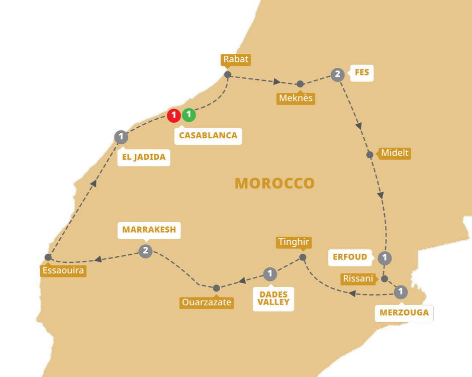 Blending effortlessly into the arid landscape, Ouarzazate has provided a backdrop for such famous movies as 'Lawrence of Arabia', 'Cleopatra' and 'Gladiator'. See the UNESCO-listed fortified village of Aït Ben Haddou in the High Atlas Mountains. Continue through the Tizi-n-Tichka Pass to Marrakesh - the 'Red City'. Like many other former imperial cities in Morocco, Marrakesh comprises an old fortified city - the Medina - and an adjacent modern city. Marrakesh is home to Morocco's largest traditional souk (market). (B) Stay: Ryad Mogador Menara