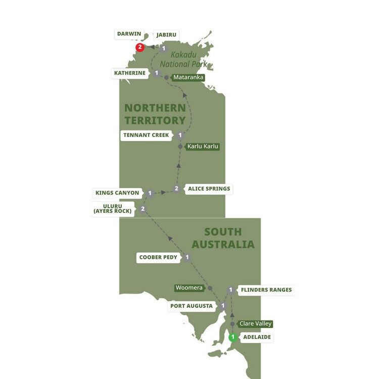 Hello, adventurers! Kick off your 15-day Outback adventure in Adelaide (flights to arrive prior to 12.30pm). This beautiful city is known for its festivals, sporting events, colonial churches and architecture, amazing food, and as the gateway to renowned wine regions in the Clare Valley and McLaren Vale.