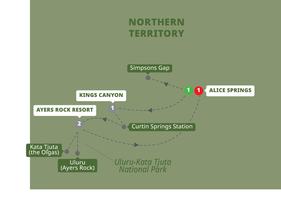 Leave Alice Springs behind and journey towards Kings Canyon, pausing at Erldunda Roadhouse, known as the ‘Centre of the Centre', where the Stuart and Lasseter Highways meet. Continue to Kings Canyon Resort in Watarrka National Park, where modern comforts sit amid dramatic outback scenery.
