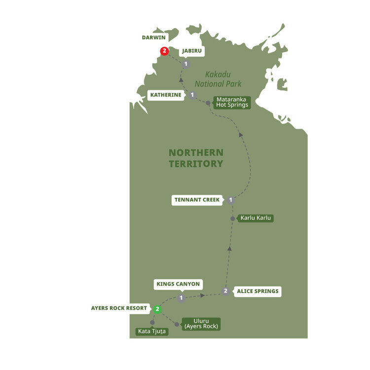 Your Northern Territory adventure comes to an end in Darwin. As you prepare to head home, take with you memories of glowing desert sunsets, ancient rock art, dramatic gorges and the unforgettable spirit of Australia's Outback.