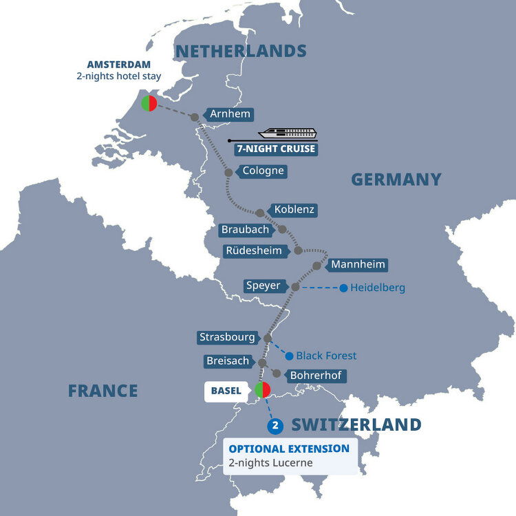 Bid farewell with “fair winds and fond memories” to your Experience Director and Experience Manager, crew and fellow cruise companions as your Rhine journey comes to an end. (B)