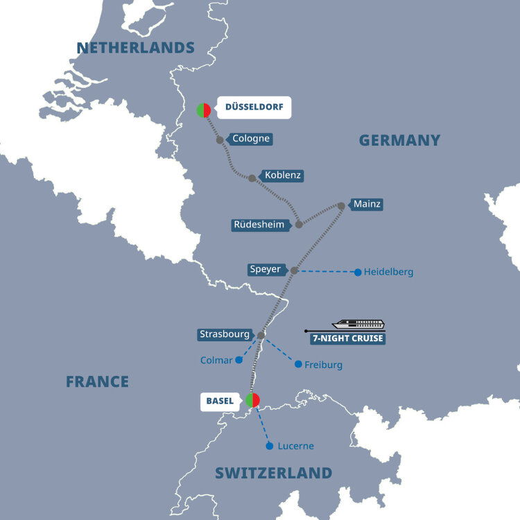 Join your ship in Basel and settle in as your festive journey begins. Meet your Experience Director and Experience Manager, then relax and get to know your surroundings. Enjoy dinner on board and start soaking up the seasonal atmosphere of your Christmas market cruise. (D)