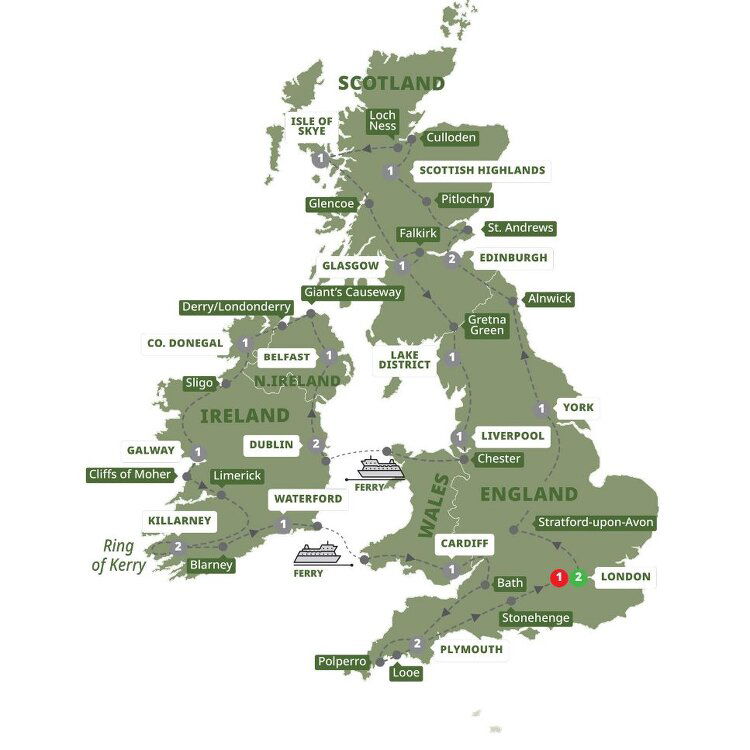 Travel to the ancient town of Chester where your orientation tour will take you past its Roman walls and famous Tudor 'Rows'. Continue along the scenic North Wales Coast to the island of Anglesey en route to Holyhead. Cross the Irish Sea to Dublin, the charismatic Irish capital. (B) Stay: Clayton Cardiff Lane