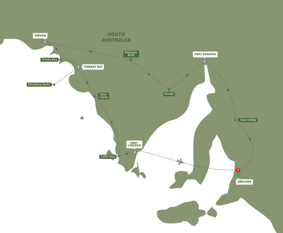 Depart Adelaide and travel into the Clare Valley, one of South Australia's leading wine regions. After around 90 minutes on the road, stop at Knappstein Wines and gather at the cellar door for a tasting that introduces the character of the valley, including its well-known Riesling. Continue north to Port Augusta, where a broad harbour reaches into the Spencer Gulf.