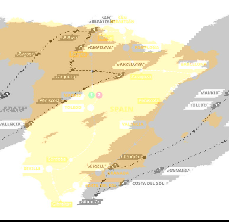 Spend today at leisure exploring the city. Visit the Royal Palace with its spectacular Goya artworks, relax in the leafy Buen Retiro Park or enjoy the flavours and aromas of jamon in the Market of San Miguel. This evening, join your Travel Director and fellow travellers for an unforgettable dinner to celebrate an epic adventure through Spain. (B/D)
