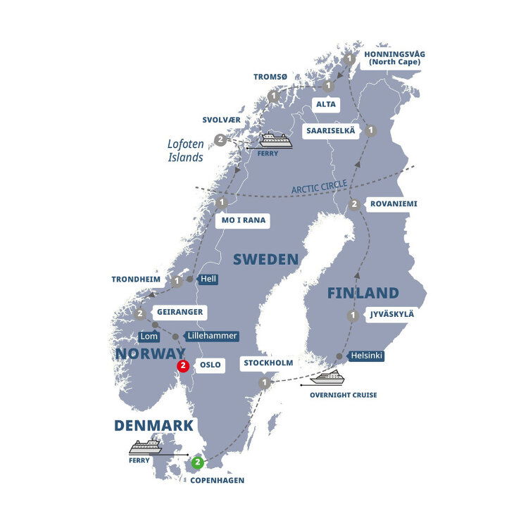 Follow the winding route along the fjords of northern Norway to Tromsø, the 'Gateway to the Arctic'. Here you'll discover a multicultural community thriving in its Arctic environment. The backdrop may be snow-capped, but there's nothing chilly about the warmth of the locals, as you'll come to learn on your free evening in this 'Capital of the North'. (B) Stay: Scandic Grand Tromsø