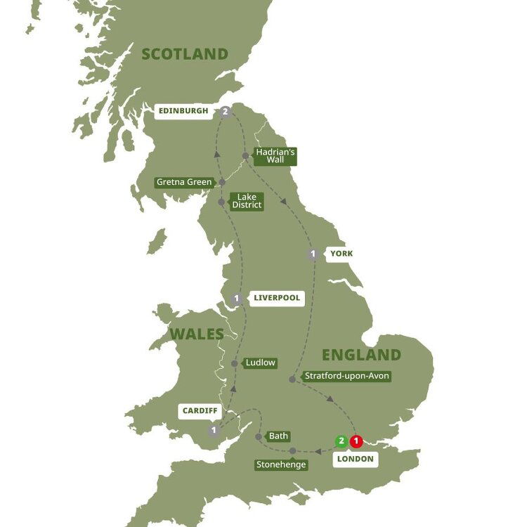 Brightly colored Union Jacks pave your way to an unforgettable journey through Britain, which kicks off in London. Visit 'The City' and see the imposing dome of Christopher Wren's St. Paul's and the Tower of London, or admire the pageantry of royal palaces, cathedrals and parks, exploring the city on your own terms. Stay: Hilton Kensington