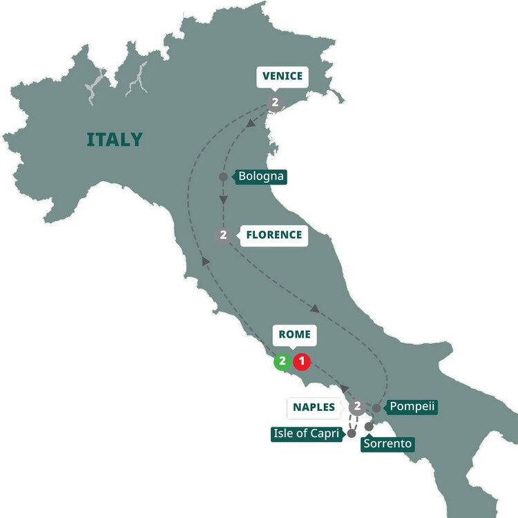 Your launch pad to an epic Italian tour begins in the Eternal City of Rome. Tread in the footsteps of gods and goddesses, emperors and gladiators as you explore its ancient streets before joining your Travel Director for dinner. (D) Stay: Grand Tiberio , Shangri-La Roma