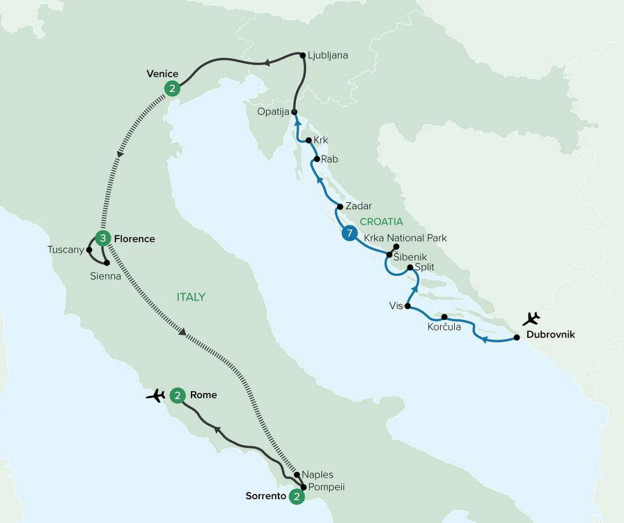 Cruise to the Croatian island of Vis, where you'll disembark to explore its remote, untouched beauty on a scenic drive around the island. Then, sail to Split, one of the Adriatic's most vibrant port cities. Join your guide for a walking tour of Diocletian's Palace, built by the Roman Emperor for his retirement in AD 305. The palace's Old Town is enclosed within its walls, making it the only Roman palace still continuously inhabited since ancient times. Your ship remains docked overnight, giving you the opportunity to explore Split at your leisure after dinner onboard. (B/L/D)