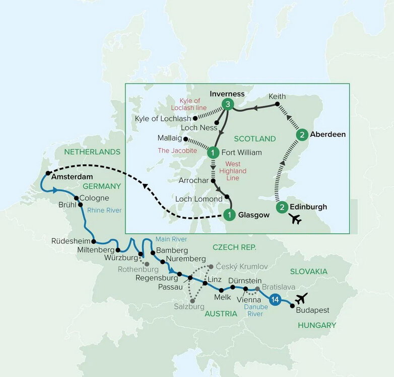 After breakfast, your rail journey concludes with a transfer to the airport for your included flight to Amsterdam. On arrival, you'll be met and transferred to your river ship. This evening, meet your Cruise Director and fellow travellers at a Welcome Reception. Stay 14 Nights: aboard your Travelmarvel river ship (B/D)