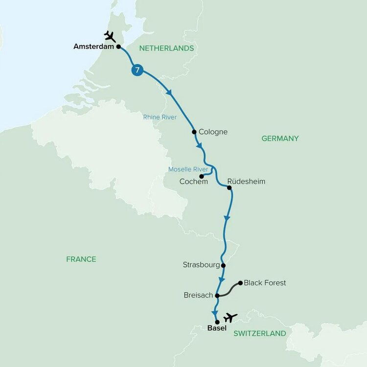 After breakfast on board, disembark and be transferred to Basel airport for your onward flight. (B)