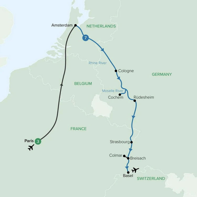After breakfast on board, disembark and be transferred to Basel airport for your onward flight. (B)