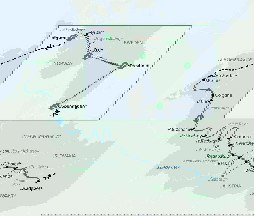 Today, travel on the famous Bergen Railway from Oslo to Myrdal, widely regarded as one of the world's most scenic rail journeys, crossing Europe's highest mountain plateaus. From Myrdal, continue by rail to the fjordside village of Flåm for a special Insider Experience. On arrival in Flåm, transfer by coach to Bergen, where your evening is free to relax at your hotel or head out to experience the local dining scene. Stay Three Nights: Bergen, Clarion Hotel Admiral or similar (B/D)