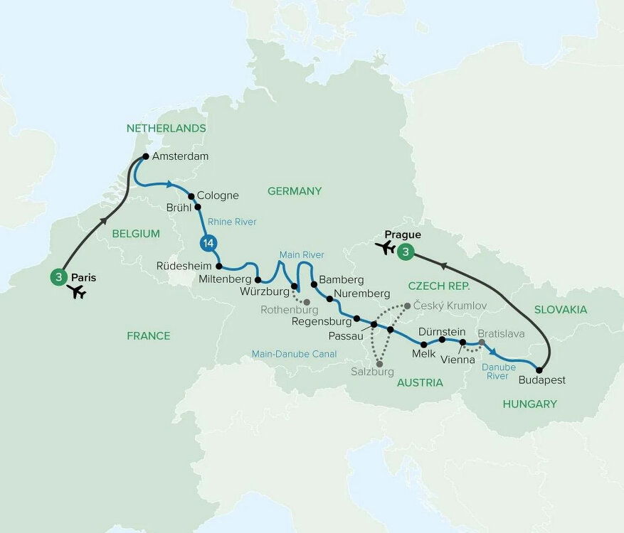 Explore Nuremberg, once the site of Hitler's infamous rallies. Wander its cobblestone streets, discovering hidden boutiques and artisan stores. Finish your day cruising through the Main-Danube Canal, crossing Europe's Continental Divide via its 16 stair-step locks. (B/L/D)