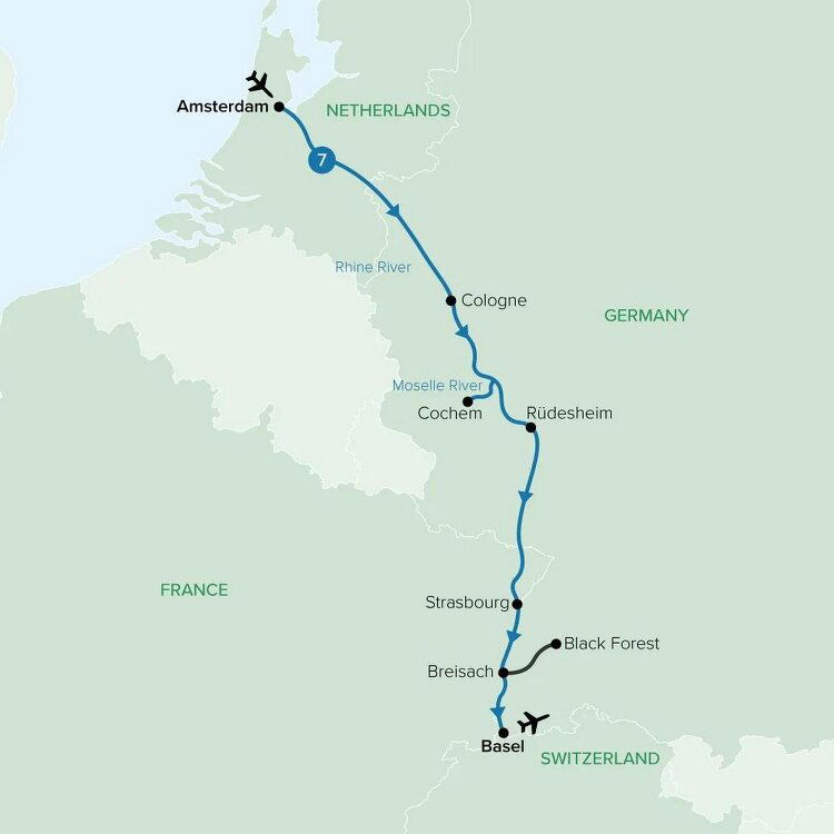 After breakfast on board, disembark and be transferred to Basel airport for your onward flight. (B)