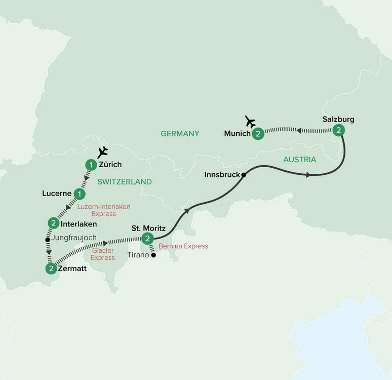 After breakfast, enjoy an Insider Experience aboard the Bernina Express. Later, return to St. Moritz by regional train. (B/D)