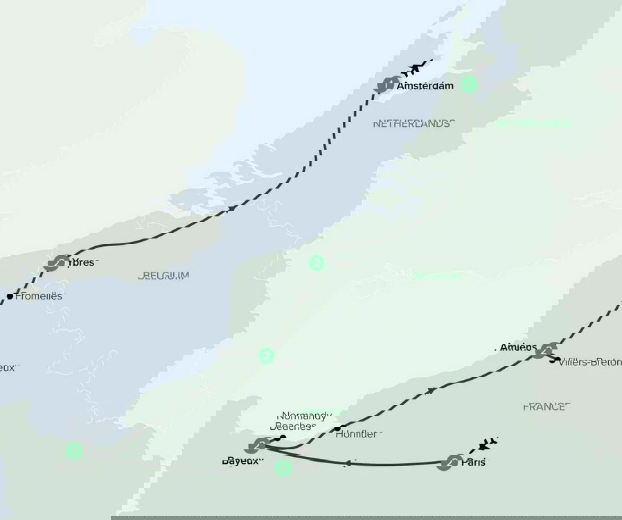 You will visit a series of important sites along the Western Front today. Begin at the Australian Memorial Park in Bullecourt, which honours Australian soldiers who fought in the First and Second Battles of Bullecourt in 1917, where heavy losses were suffered during attempts to breach the Hindenburg Line. Continue to Fromelles (Pheasant Wood) Military Cemetery, established after the recovery of Australian and British soldiers from a mass burial site discovered in 2008. The men were killed during the Attack at Fromelles in July 1916 and later reinterred with full military honours.