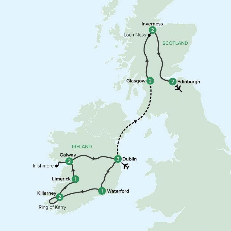 The Ring of Kerry (166 km) is Ireland's most famous and panoramic route. The breathtaking beauty of the Iveragh Peninsula lies in the remarkable diversity of its scenery, offering constant contrasts. As you travel around the Ring, take in spectacular vistas - mountains, lakes, and stunning views of the Atlantic Ocean. Return to Killarney and enjoy free time at leisure. (B)