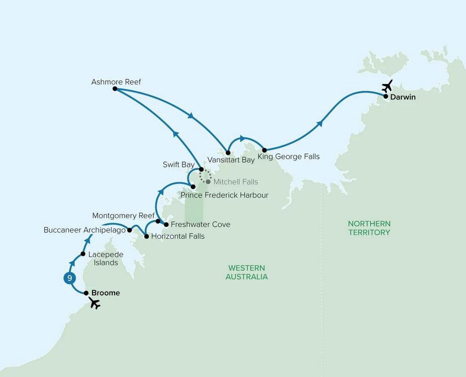 Explore beautiful Vansittart Bay today, landing and experiencing its greatest sights. Venture out across the salt flats to see the US Air Force C-53 plane which famously crash landed here during World War II in 1942. (B/L/D)