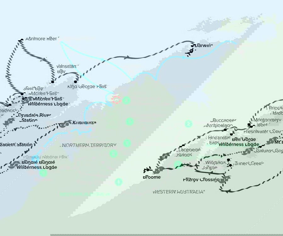 Arrive in Darwin this morning, where your tour ends after breakfast with a transfer to the airport. (B)