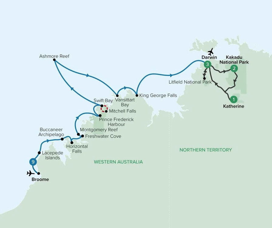 Explore beautiful Vansittart Bay today, landing and experiencing its greatest sights. Venture out across the salt flats to see the US Air Force C-53 plane which famously crash landed here during World War II in 1942. (B/L/D)