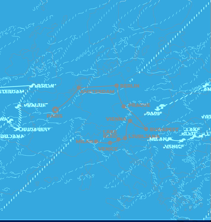 See the Eiffel Tower Paris Walking Tour Amsterdam Bar Crawl Ljubljana Orientation walk Budapest Party Cruise Bled Bike Ride Venice Gondola Ride Chocolate Making in Vienna Explore Milan's canal district Prague Castle Visit Montmartre Climb the dome at the Sacre Coeur Visit Amsterdam’s Red-Light District Amsterdam Underground Tour Amsterdam Canal Cruise Berlin Walking Tour East Side Gallery Visit Prague Old Town Budapest Walking Tour Szechenyi Thermal Baths Visit Budapest's famous ruin bars Vienna Orientation Walk Piazza del Duomo Bled Castle Viewpoint